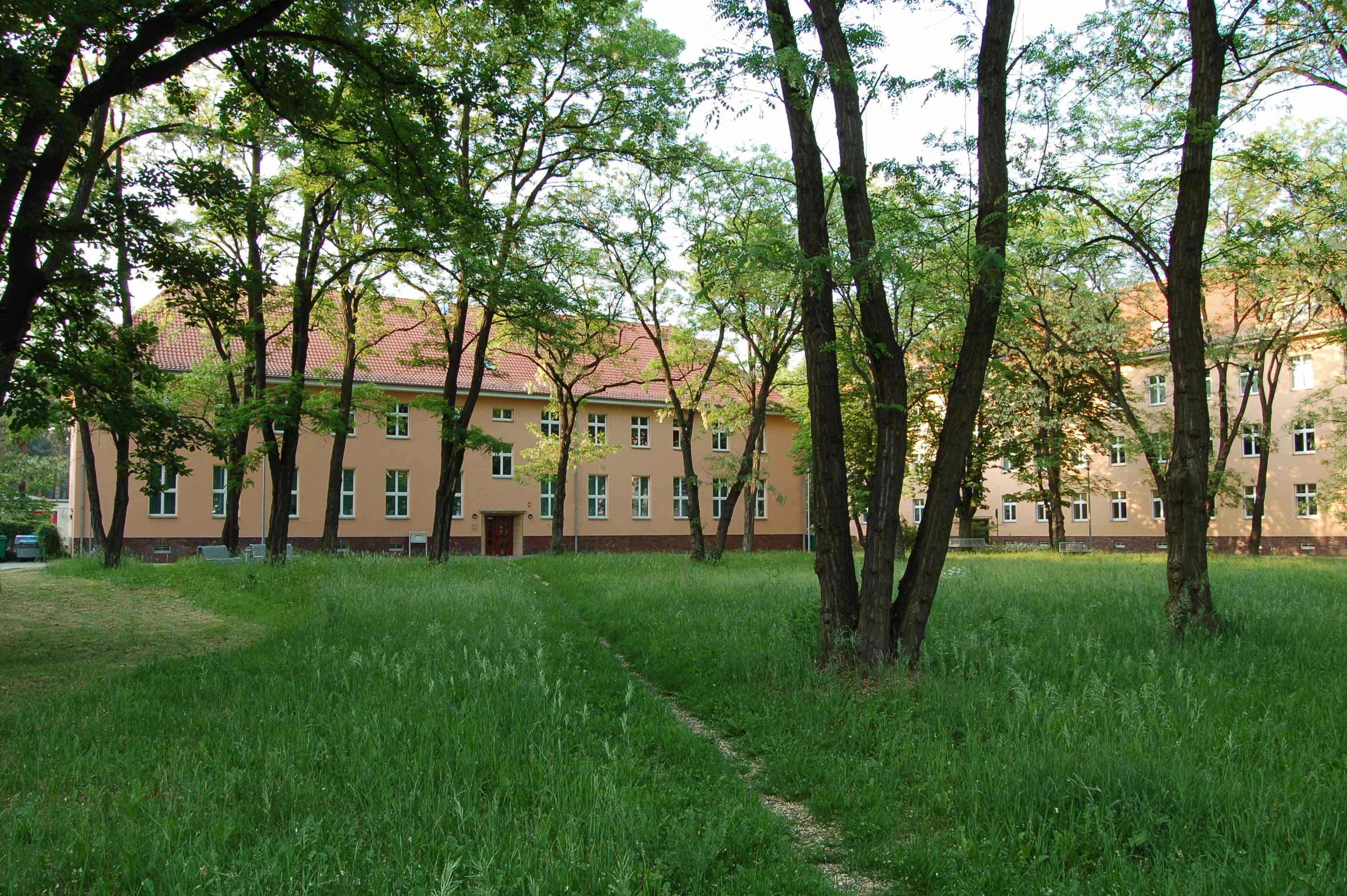 Gebäuden der Nordseite bestehen aus Rasenflächen, Roßkastanien markieren die vier Eckpunkte der Rasenflächen.