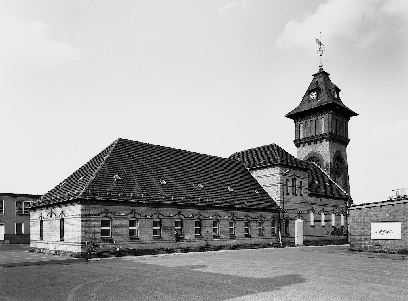 Städtischer Schlachthof, bestehend aus altem Verwaltungsgebäude und Gaststätte mit Einfriedung, Wasserturm mit Kühlhaus |