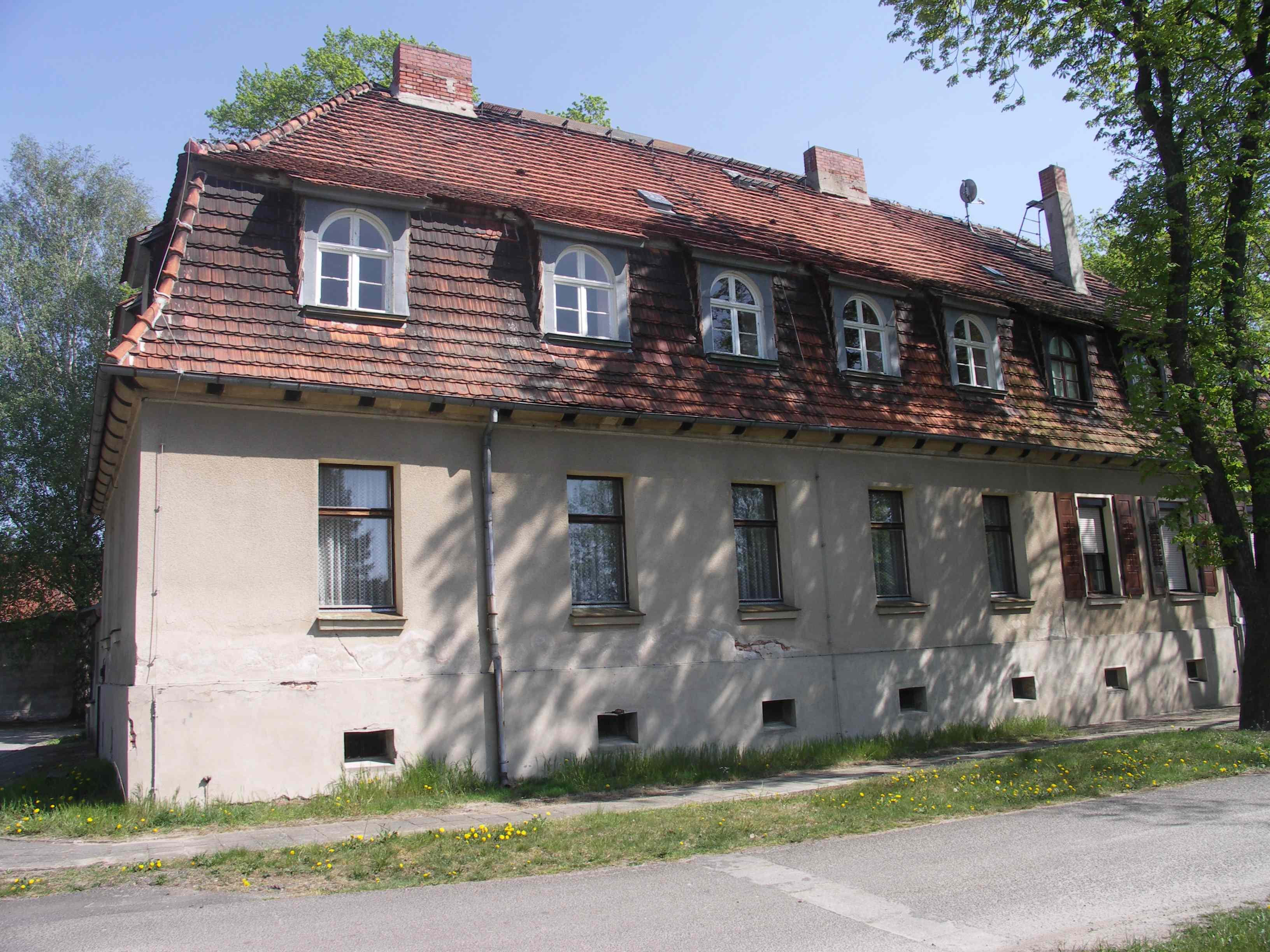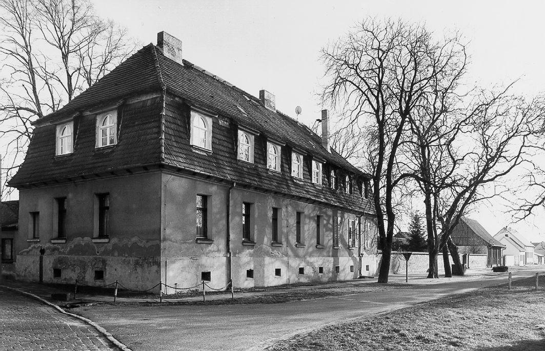 Südlicher Wirtschaftshof des Schlosses Ahlsdorf mit Schlosszufahrt und Teich, Garten des Verwalterhauses, Schlossgärtnerei