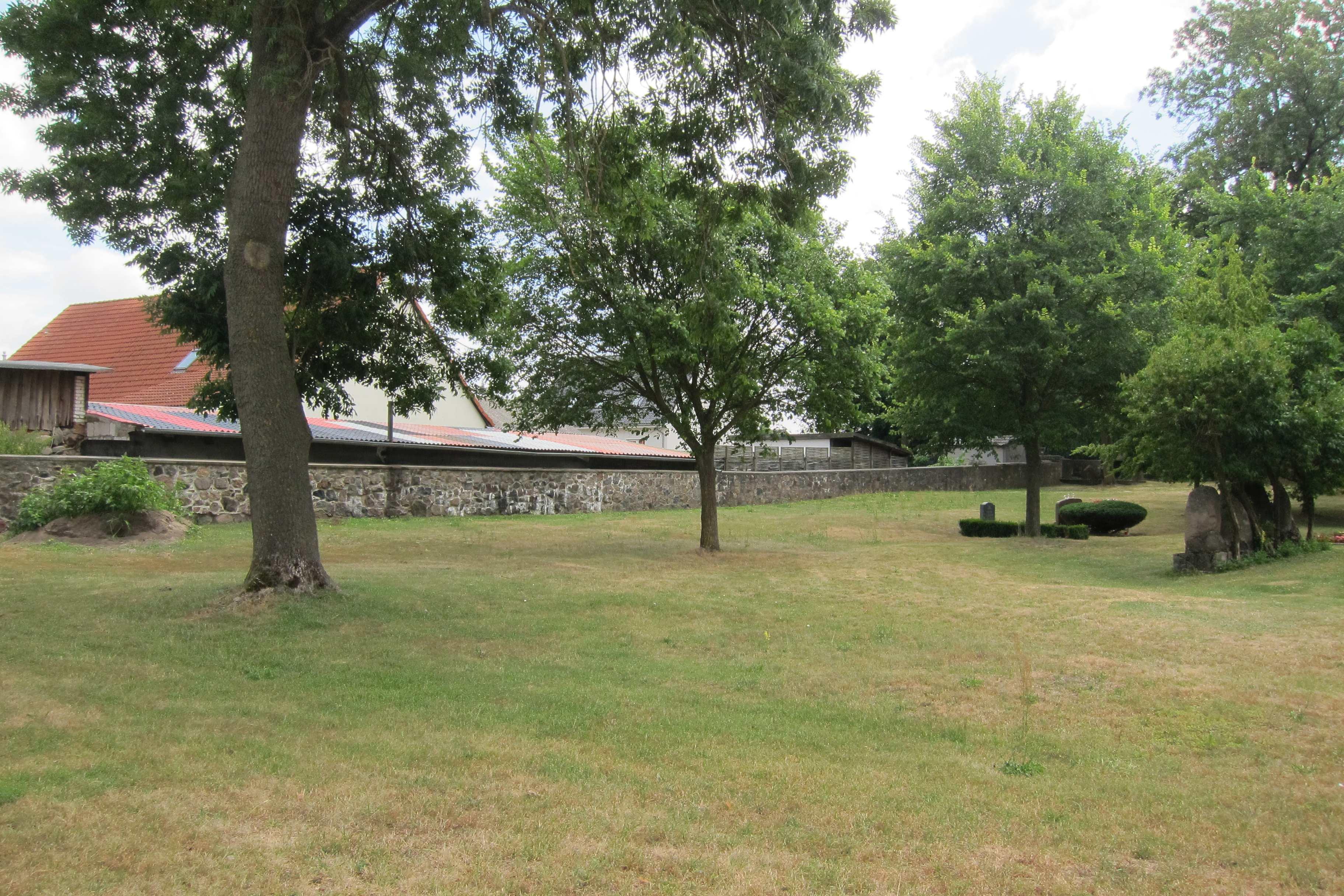 in südöstlicher Ecke halbrundförmig ausgebildet mit vorgelagertem Findling, vermutlich als Gefallenendenkmal oder Ehrenfriedhof