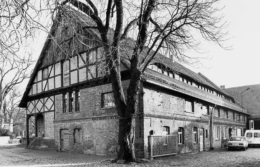 Südlicher Wirtschaftshof des Schlosses Ahlsdorf mit Schlosszufahrt und Teich, Garten des Verwalterhauses, Schlossgärtnerei