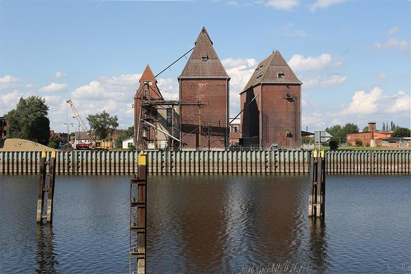 Bezeichnung 9990:Text Drei Speichergebäude (zwei Getreidesilos, ein Kornspeicher)