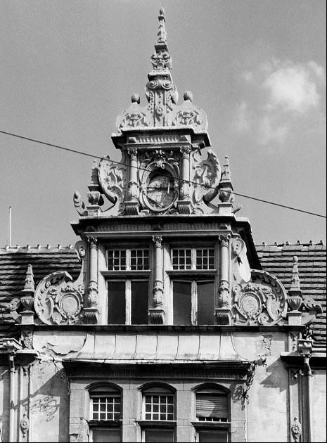 über mit Ornamenten verzierten Gurtbögen reich verzierter Eingang reich im Neorenaissancestil dekorierte Zwerchhäuser ovales