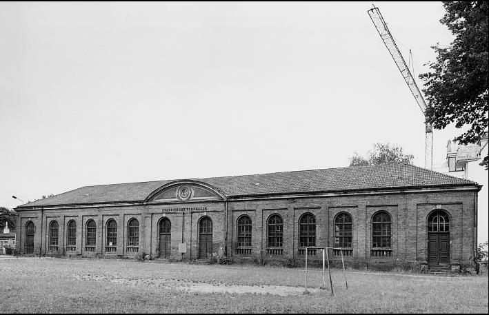 Städtische Turnhalle mit ehemaligem Feuerwehrdepot, zugehörigem Turnplatz mit Lindeneinfassung, natursteingepflasterter Zuwegung,