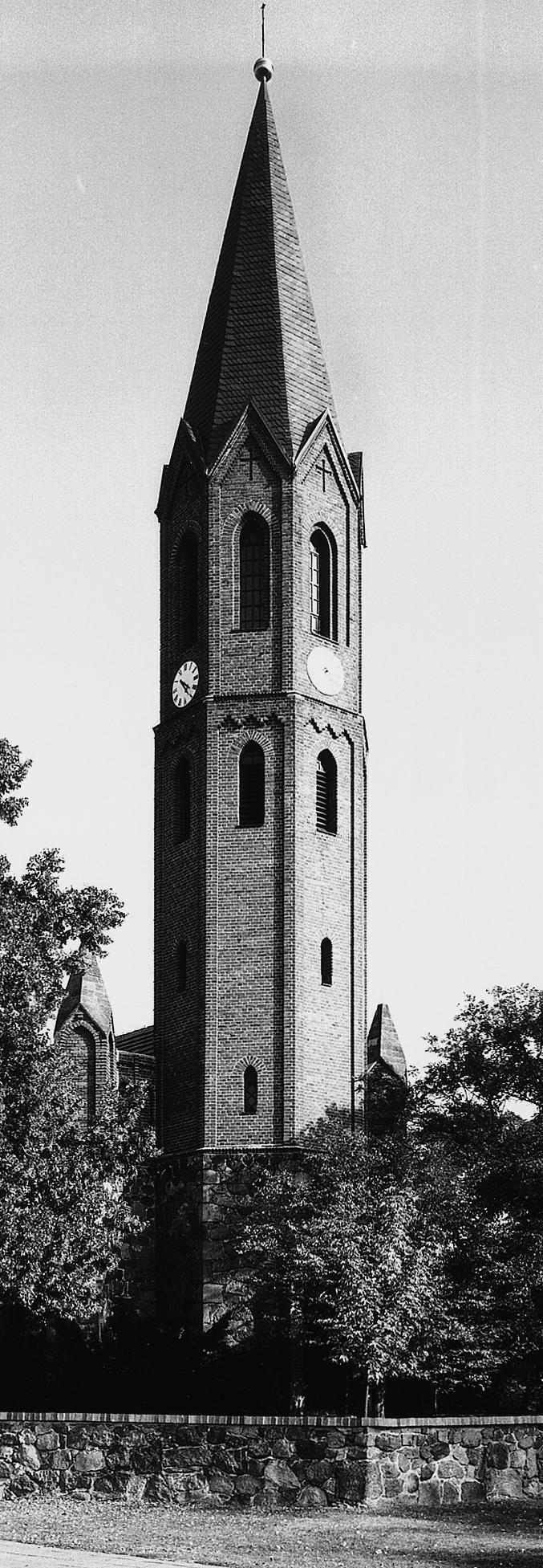 Kirchturm, Backstein, 1856, neugotischer, achteckiger Turm mit Spitzhelm |