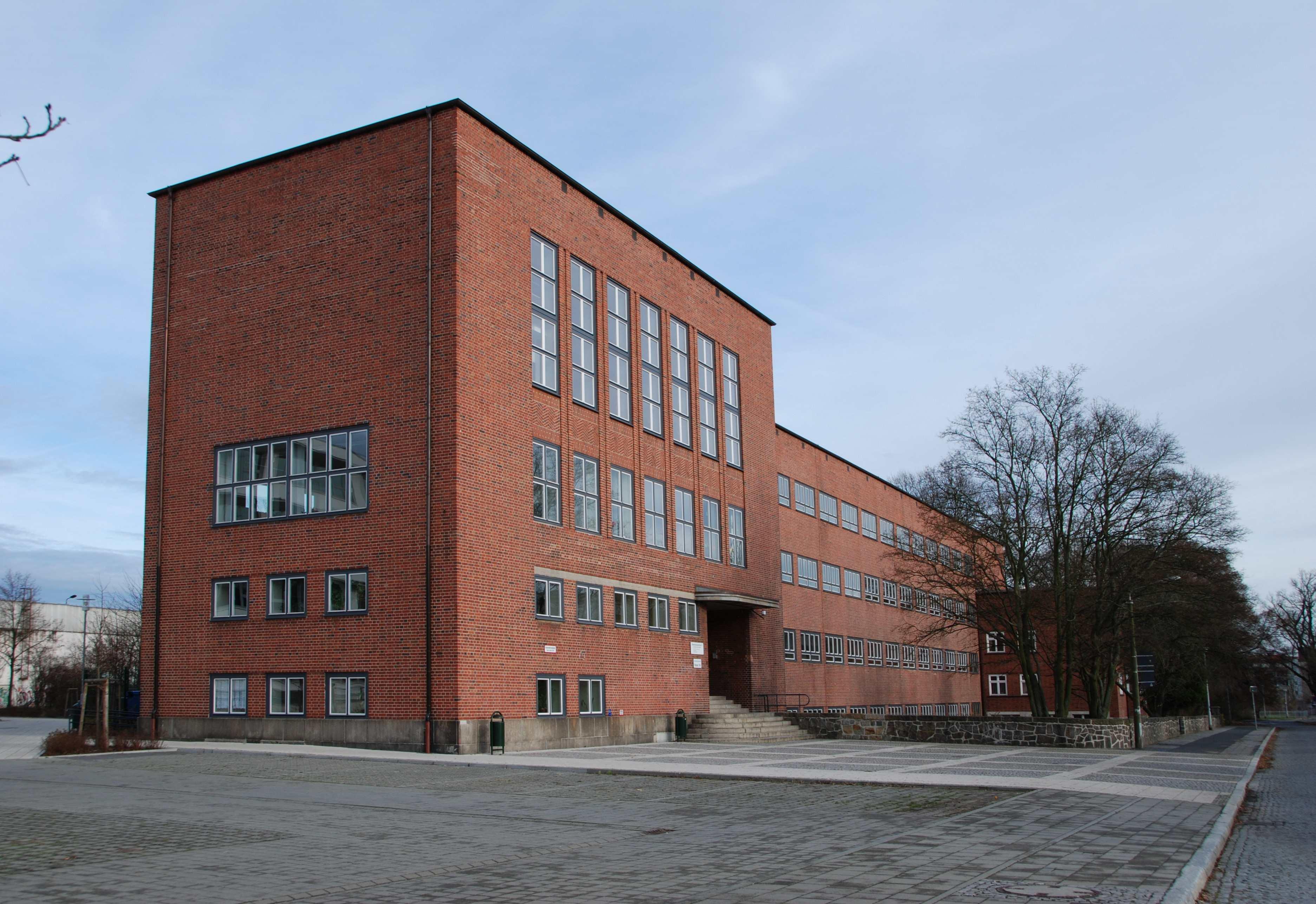 Bezeichnung 9990:Text Baugewerkeschule (heute Oberstufenzentrum I) mit Einfriedungsmauer