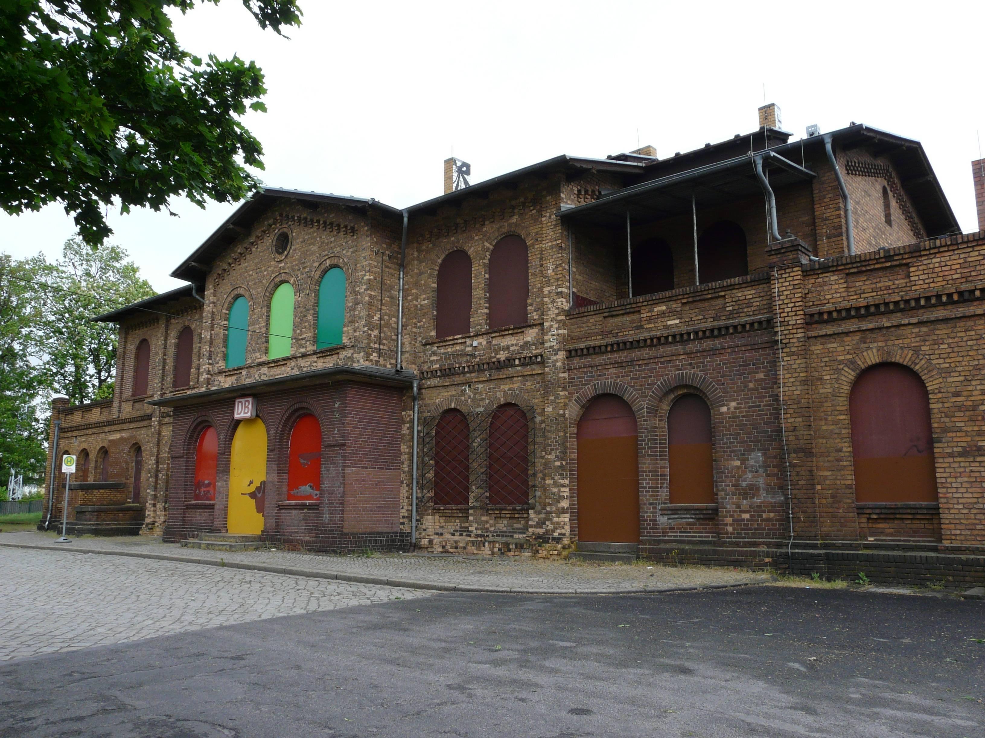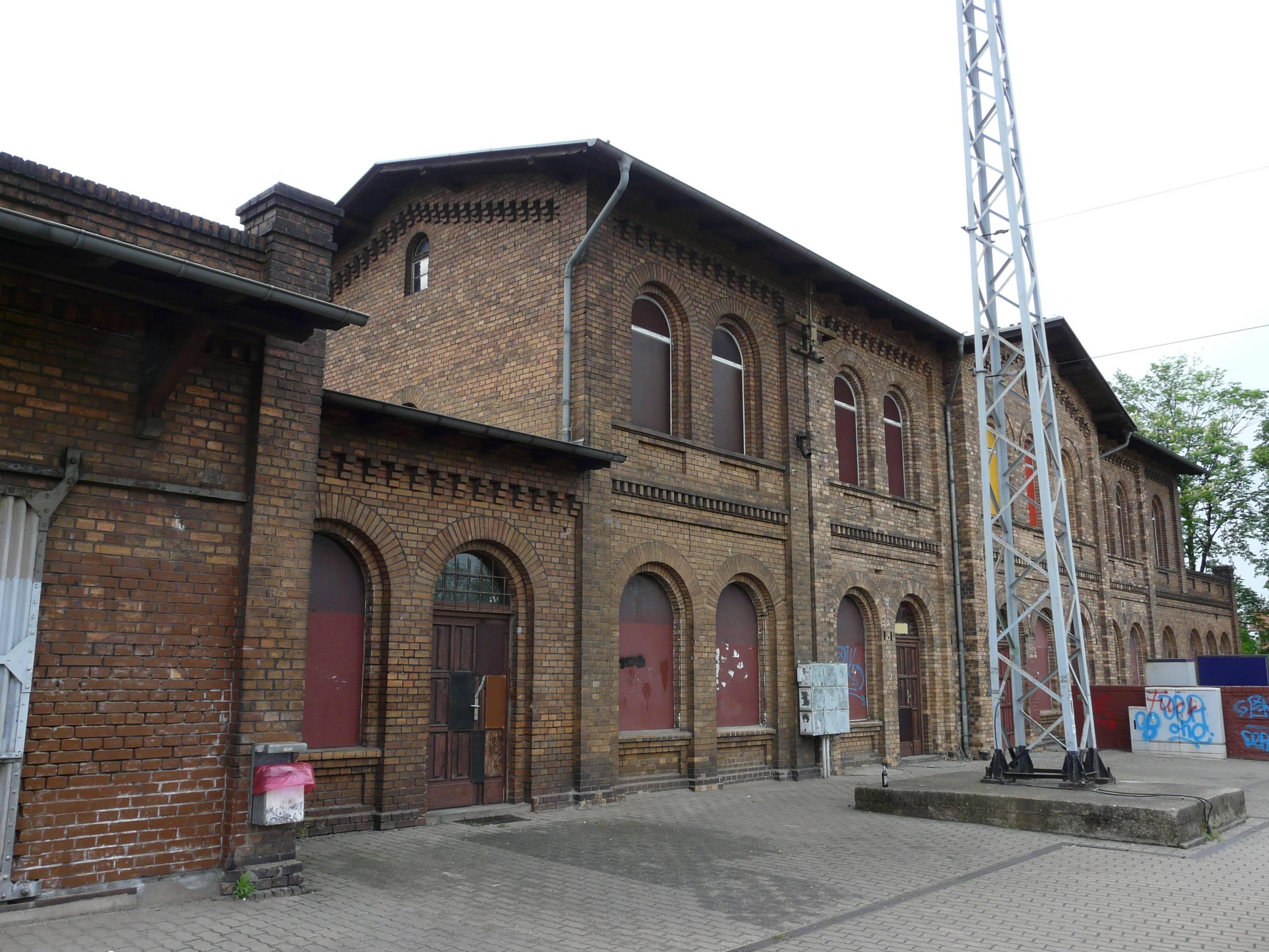Bahnhof Großräschen, bestehend aus Empfangsgebäude, Güterschuppen, Stellwerksgebäude und Vorplatz |