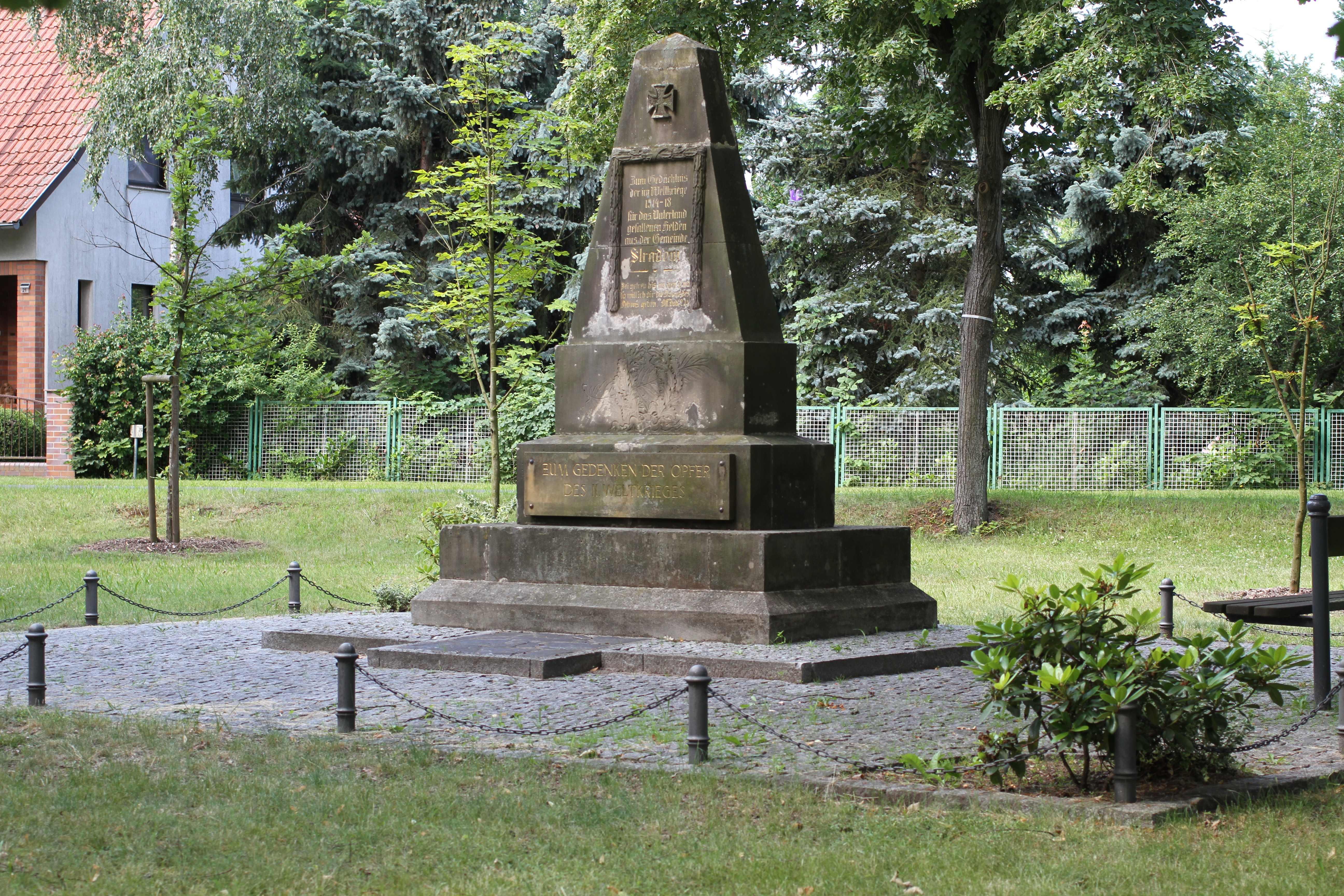 Zum Gedächtnis/ der im Weltkriege/ 1914-18/ für das Vaterland/ gefallenen Helden/ aus der Gemeinde/ Stradow./ Sei getreu bis