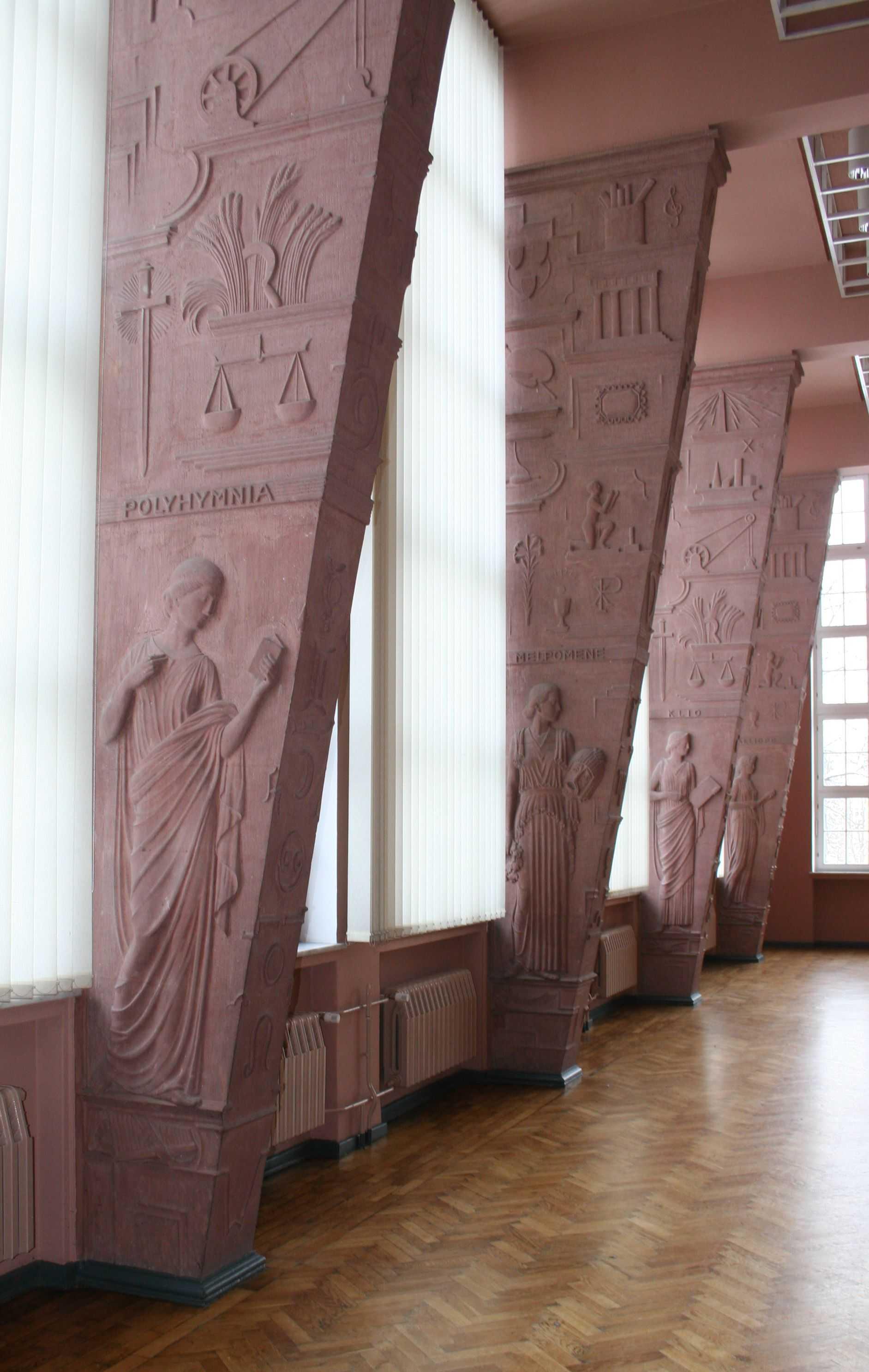 Wandgestaltung, Relief, in der Aula die seitlichen Stützpfeiler mit bildhauerischem Schmuck verkleidet (9 Musen der griechischen