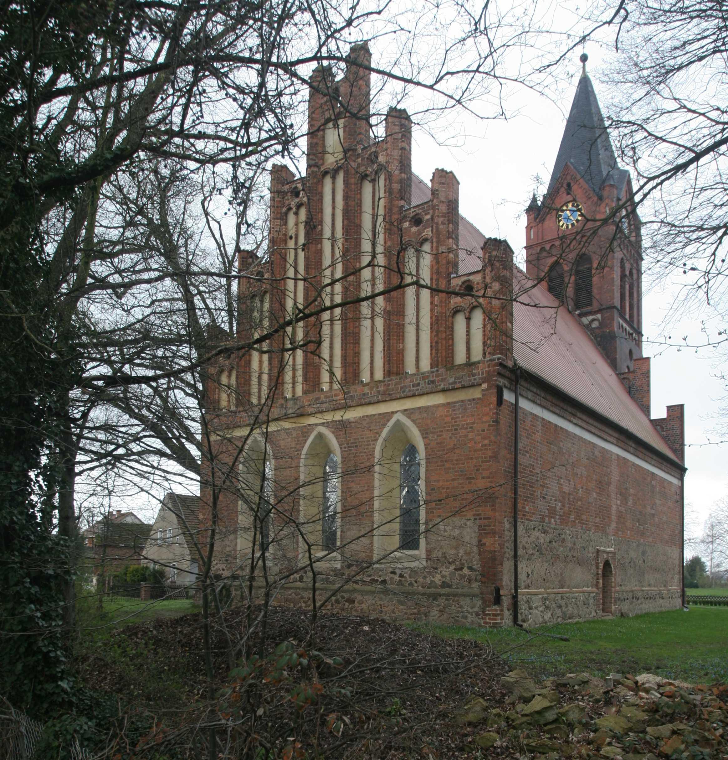 Kirchturm, Backstein, massiv, 1894, eingezogener westl. Backsteinturm in neugotischen Formen, dreigeschossig mit Faltdachhelm |