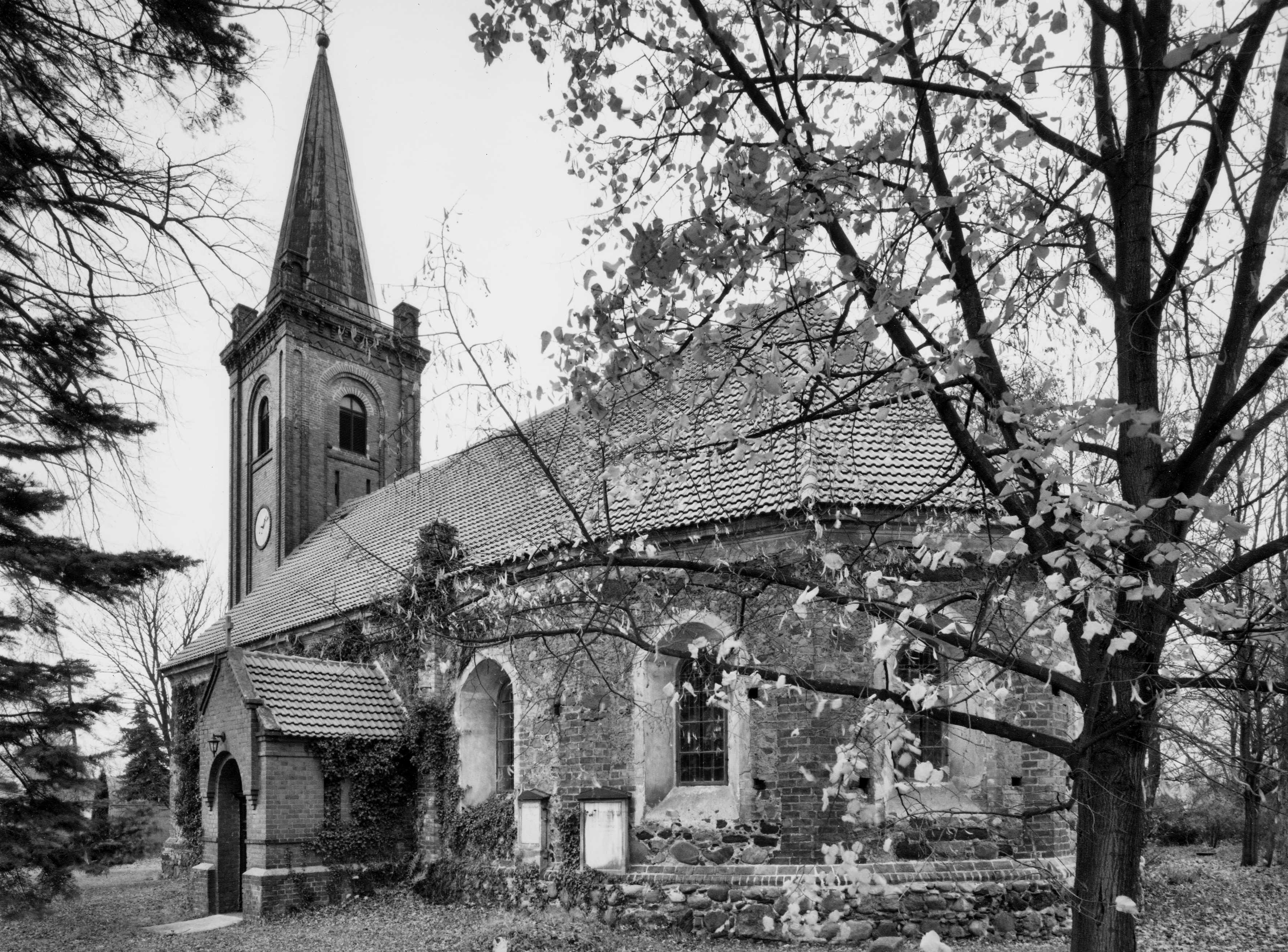 Kirchturm, Backstein, massiv, 1886, Westturm im Rundbogenstil auf quadratischem Grundriss mit Spitzhelm |