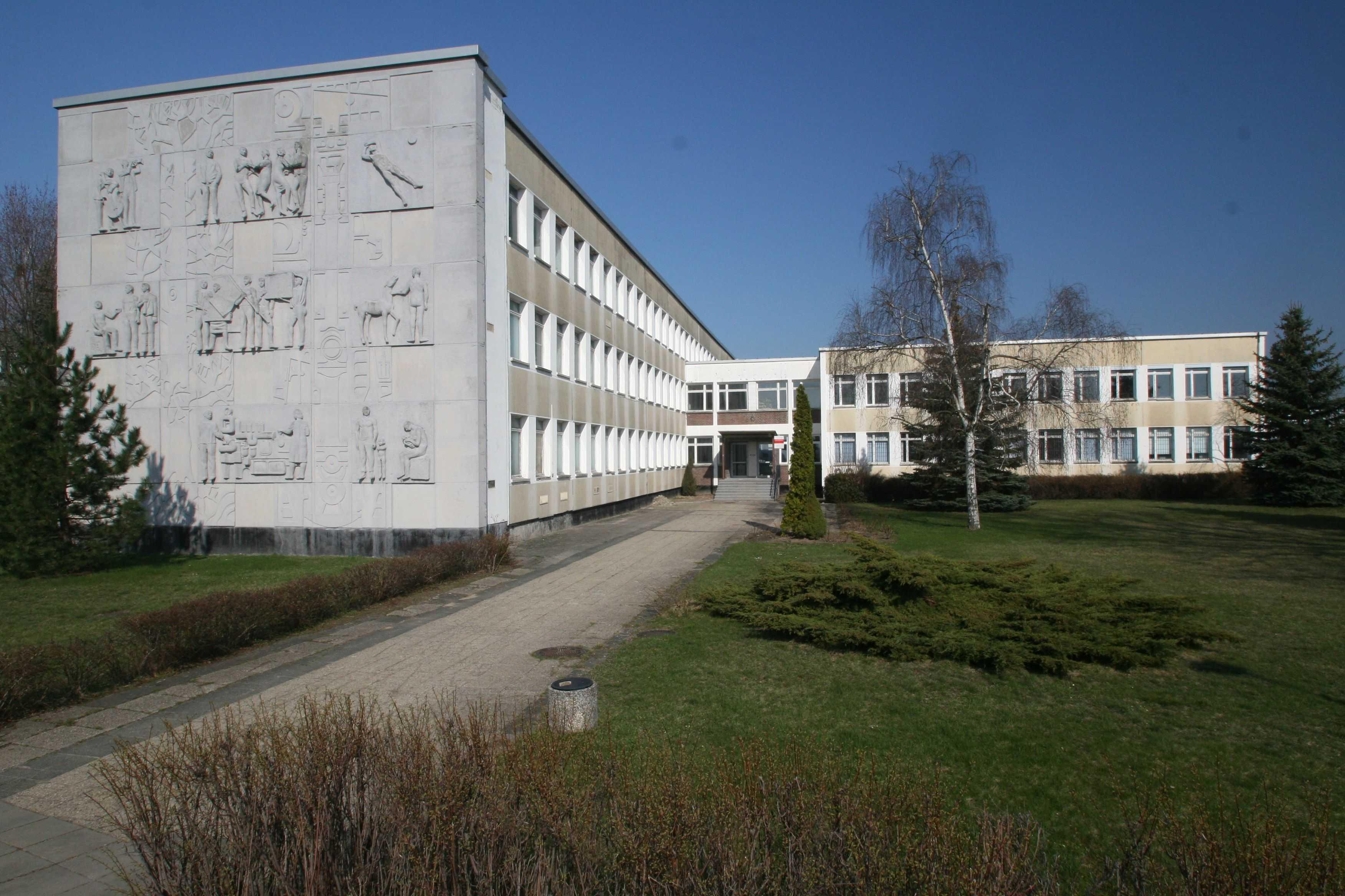 Wandgestaltung, Relief, Beton, 1970, südliche Schmalseite des Hauptgebäudes mit Betonreliefplatten in sechs verschiedenen