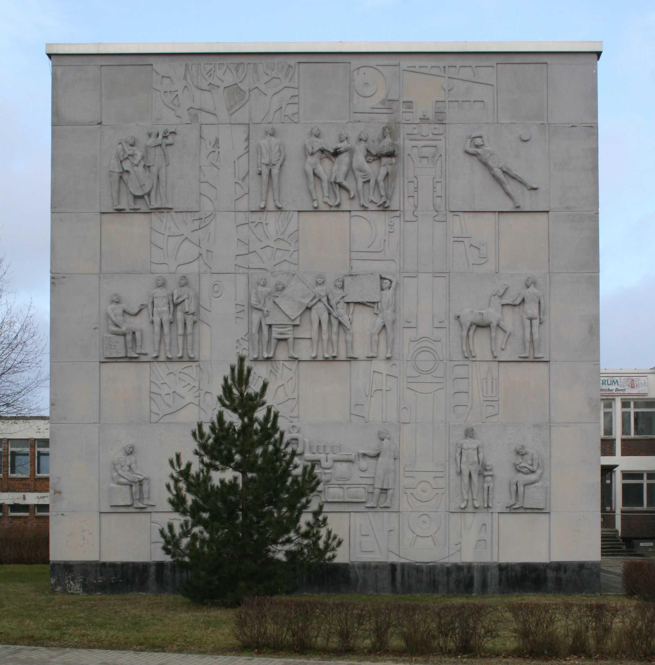 südliche Schmalseite des Hauptgebäudes mit Betonreliefplatten in sechs verschiedenen Größen (Motiv "Die Vielfalt unseres Lebens")