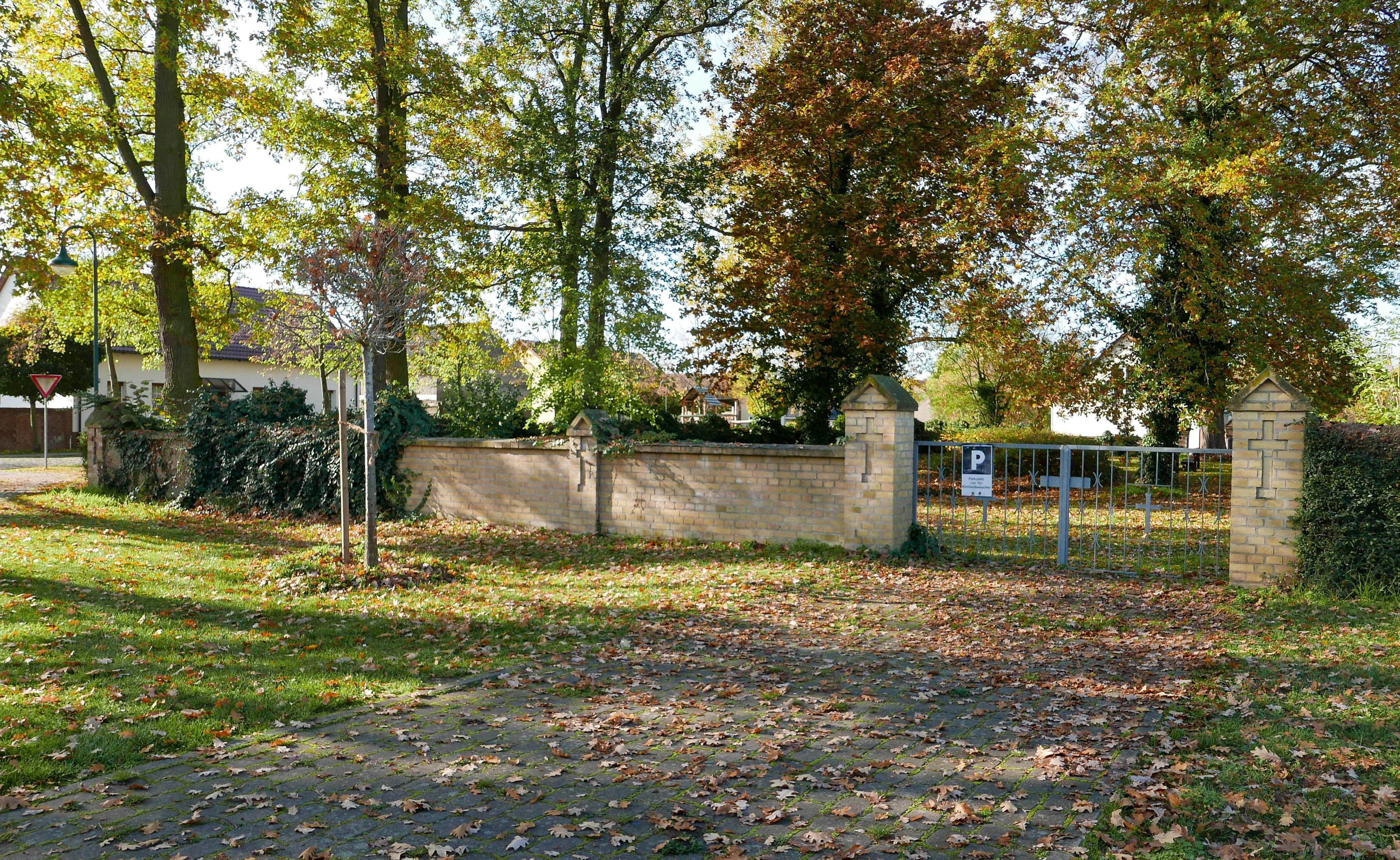 Einfriedung, Ziegel, massiv, 1851/1900, umgrenzt den Friedhof an drei Seiten, zeichnet sich durch Eckpfeiler und eine Lisenengliederung