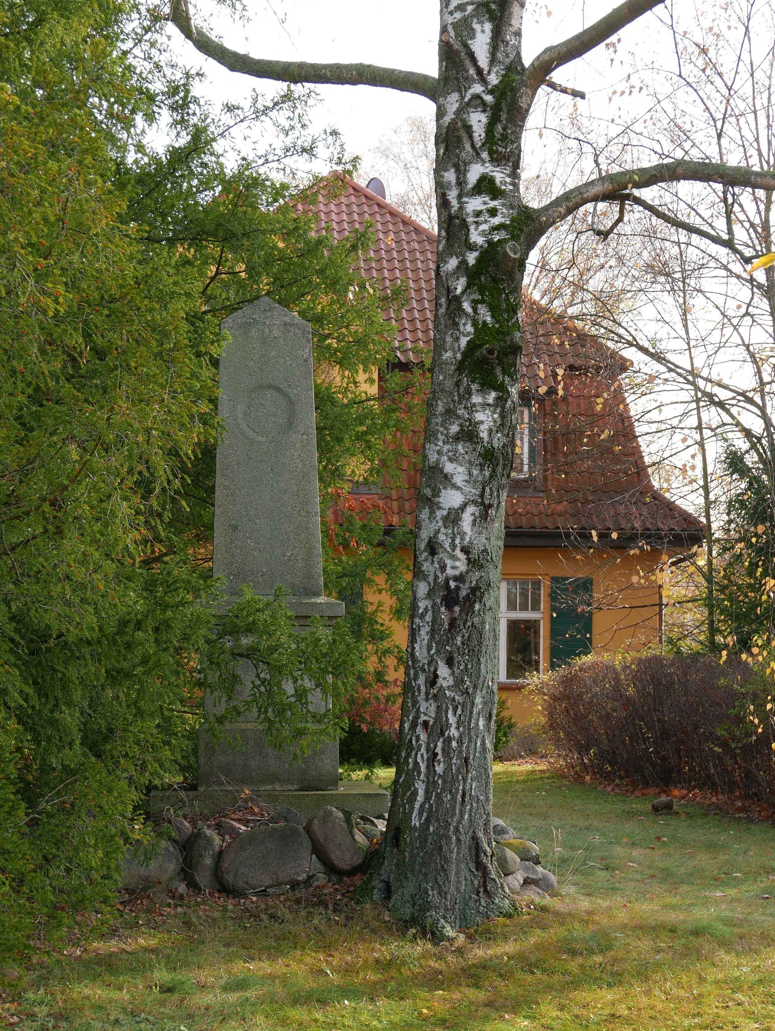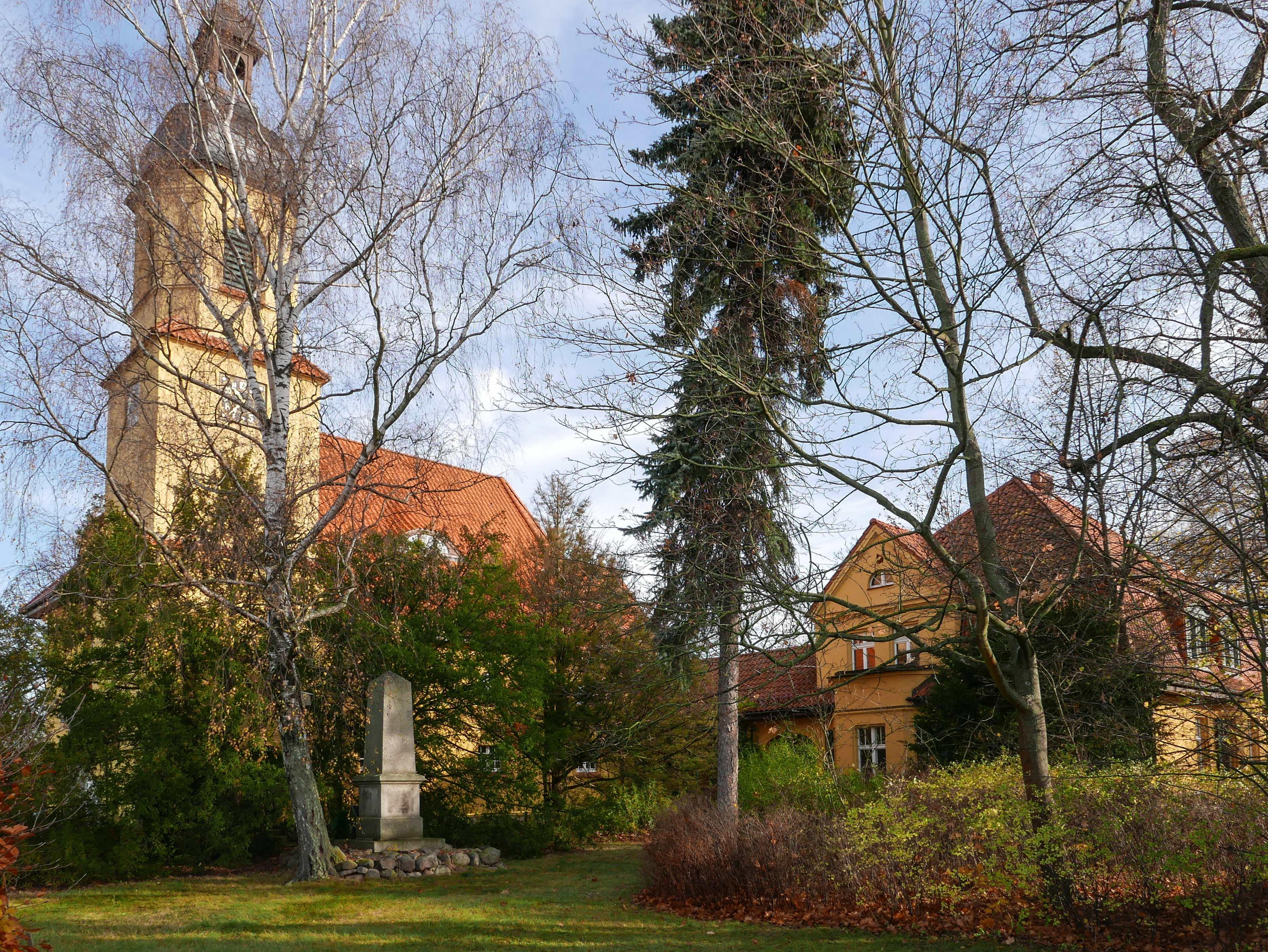 Dorfkirche mit Konfirmandensaal und Pfarrhaus sowie Kriegerdenkmal |