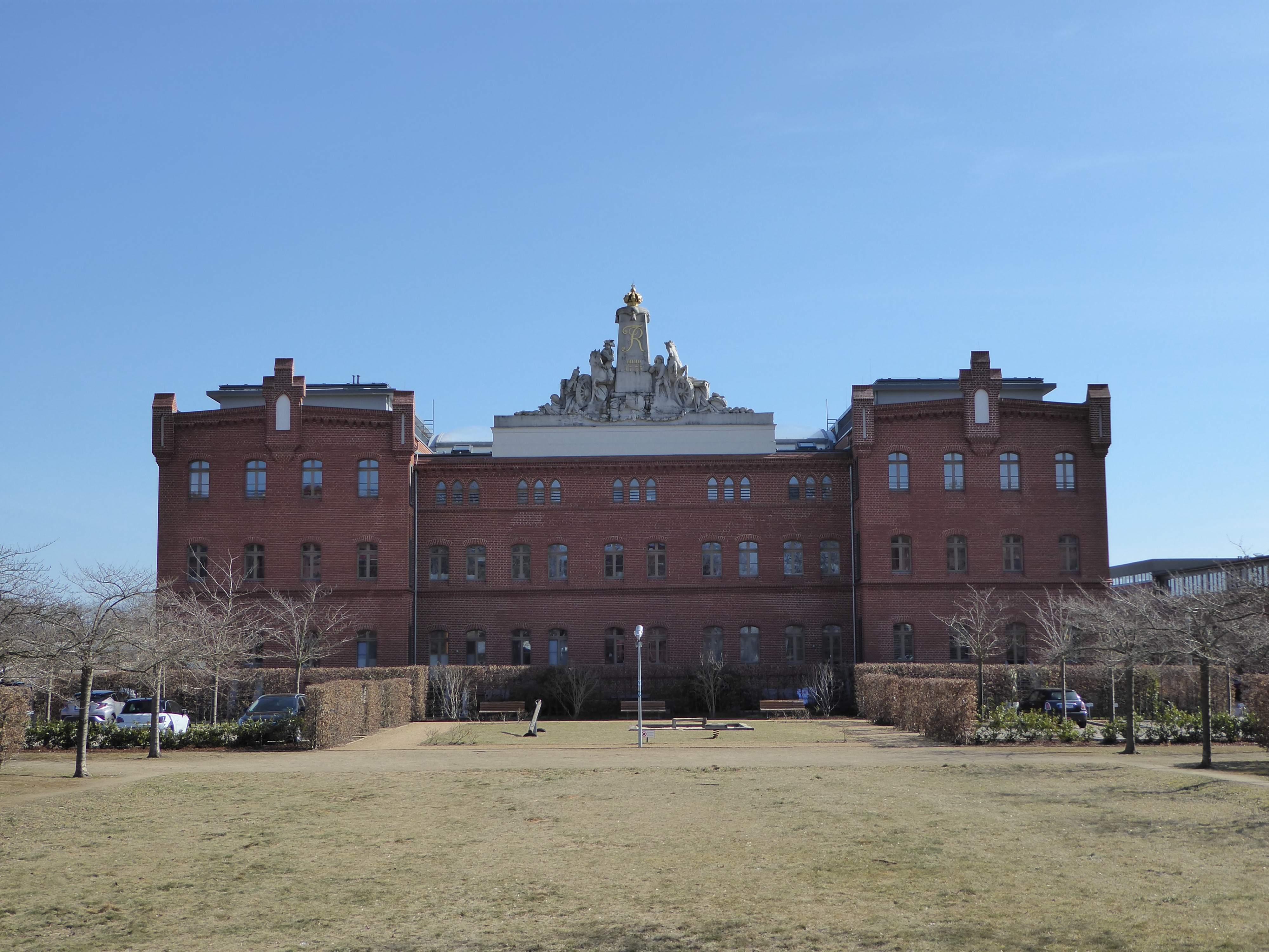 Kaserne des 2. und 4. Garde-Feldartillerie-Regiments, "Rote Kaserne" mit zwei Kontrollhäusern und Garagentrakt, Pferdestallanlagen