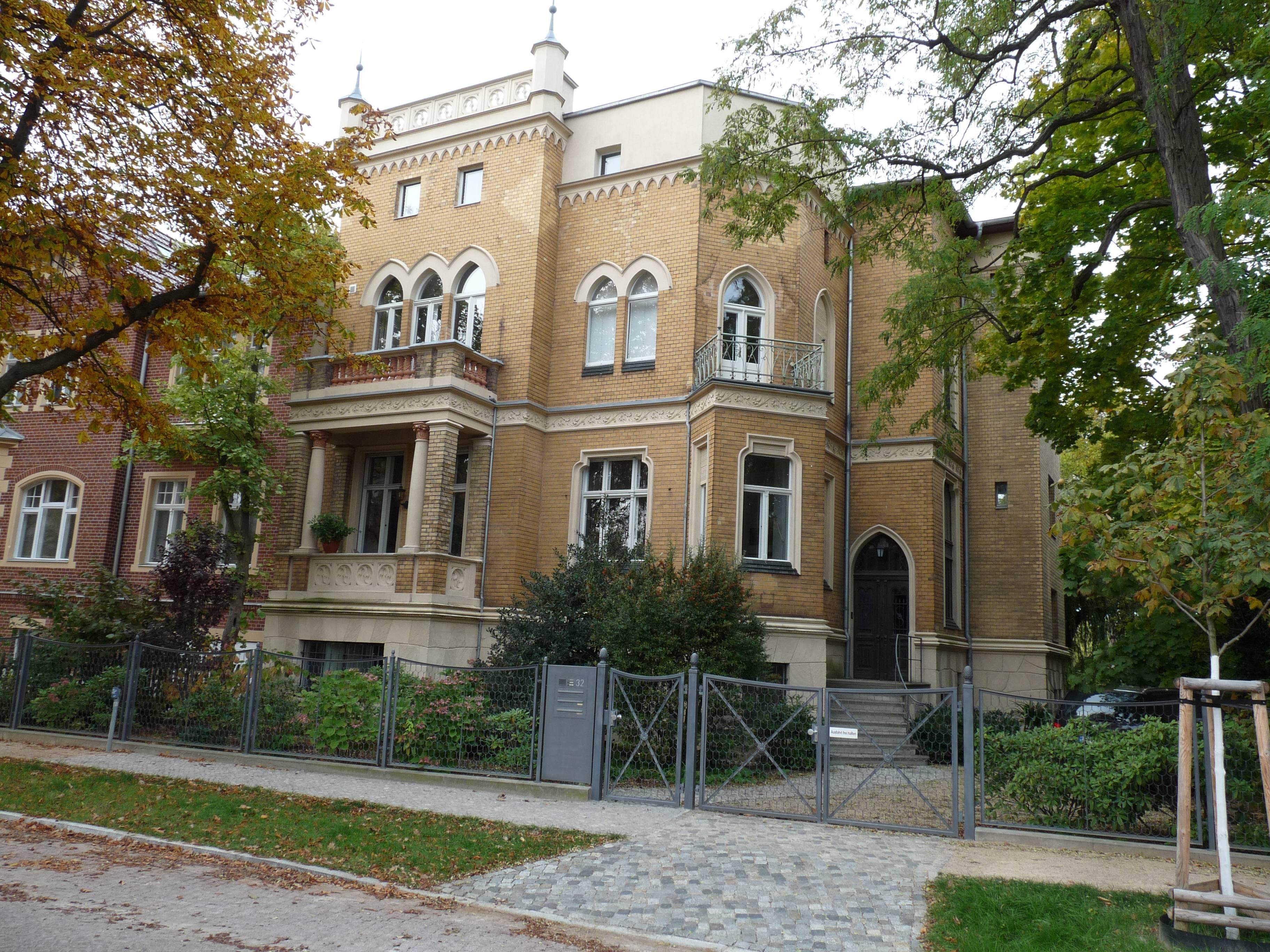 Villa mit Garten, Einfriedung und Wegepflasterung |