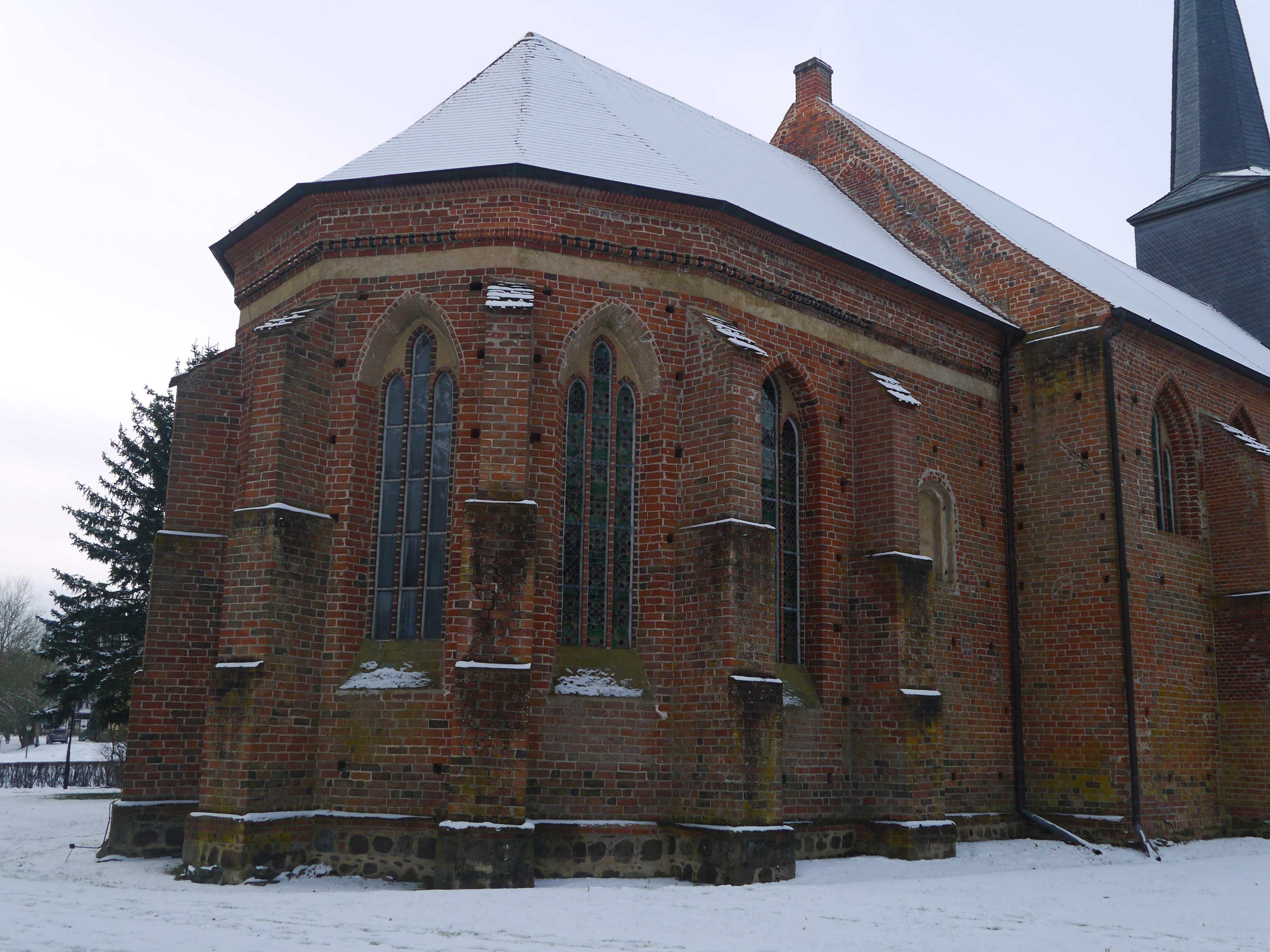 Chor, Polygonalchor, Backstein, massiv, 1301/1315, Chor schmaler als das Langhaus, zweijochig, 5/8-Schluss, Kreuzgewölbe,