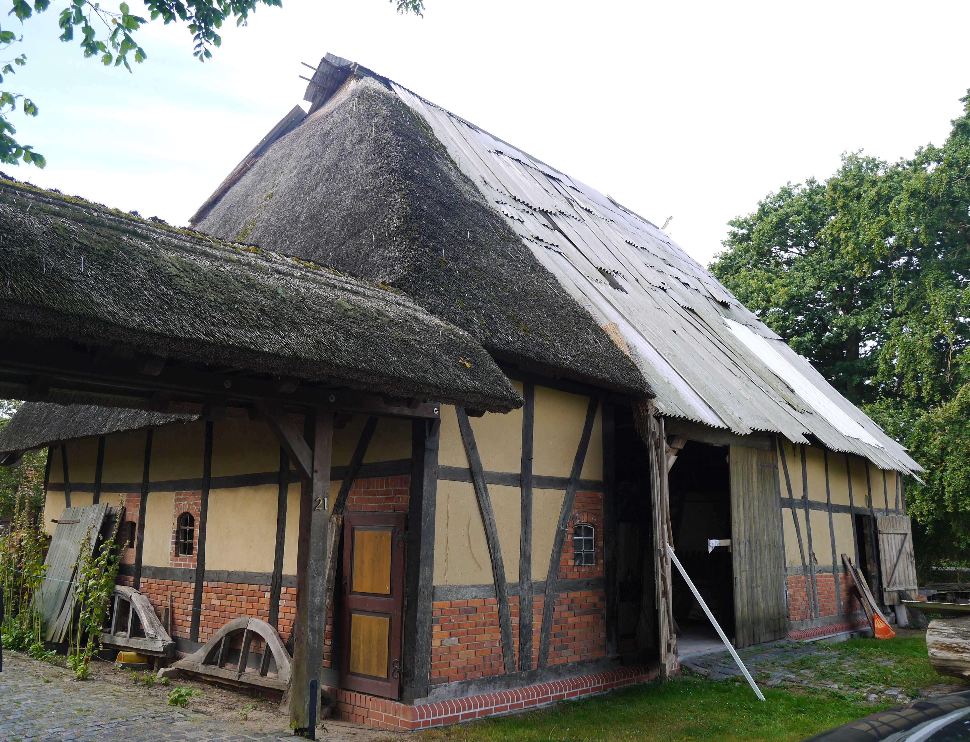 ursprünglich vollständig mit Schilfrohr-/Reetdeckung, heute teilweise wiederhergestellt |