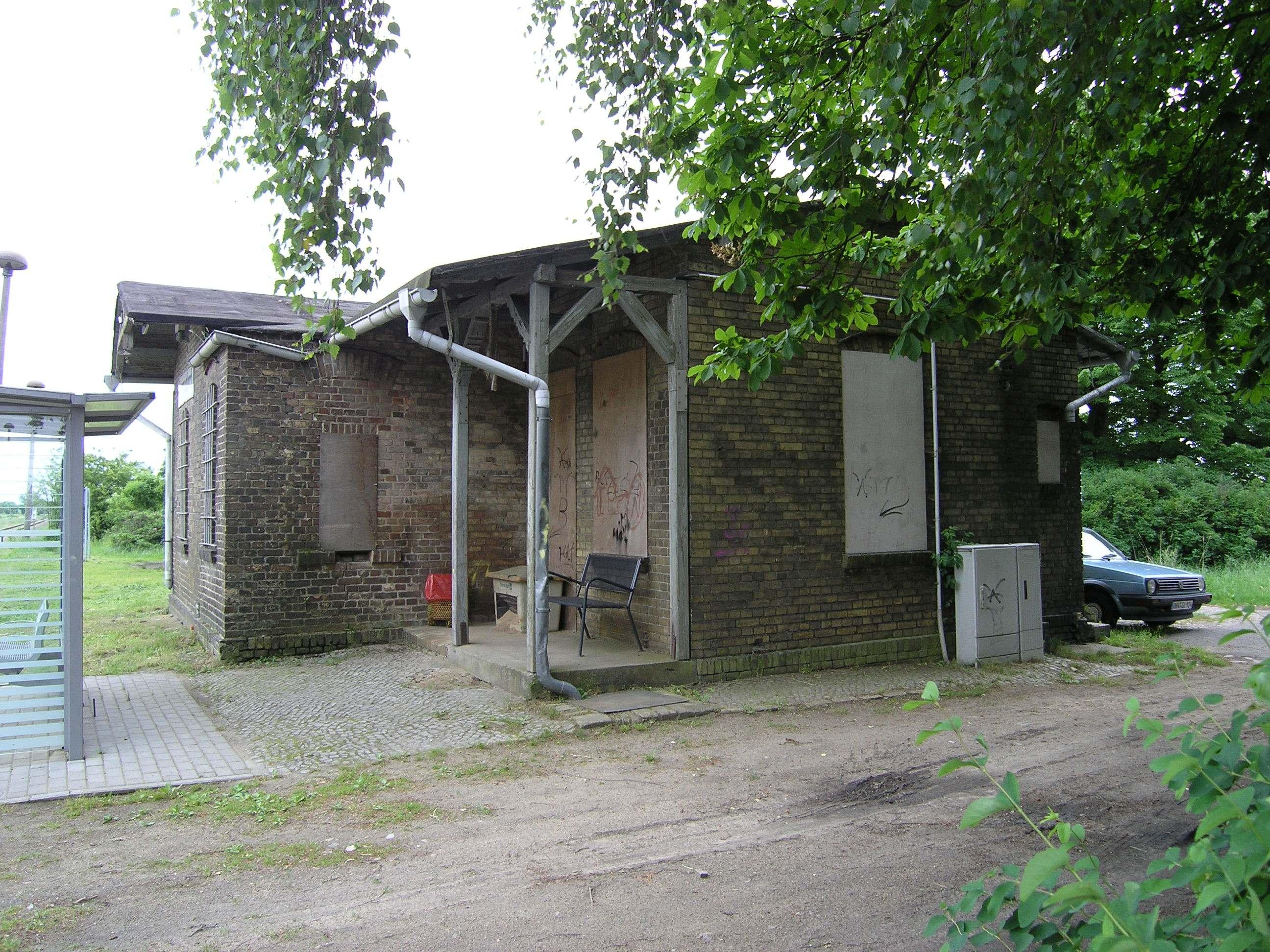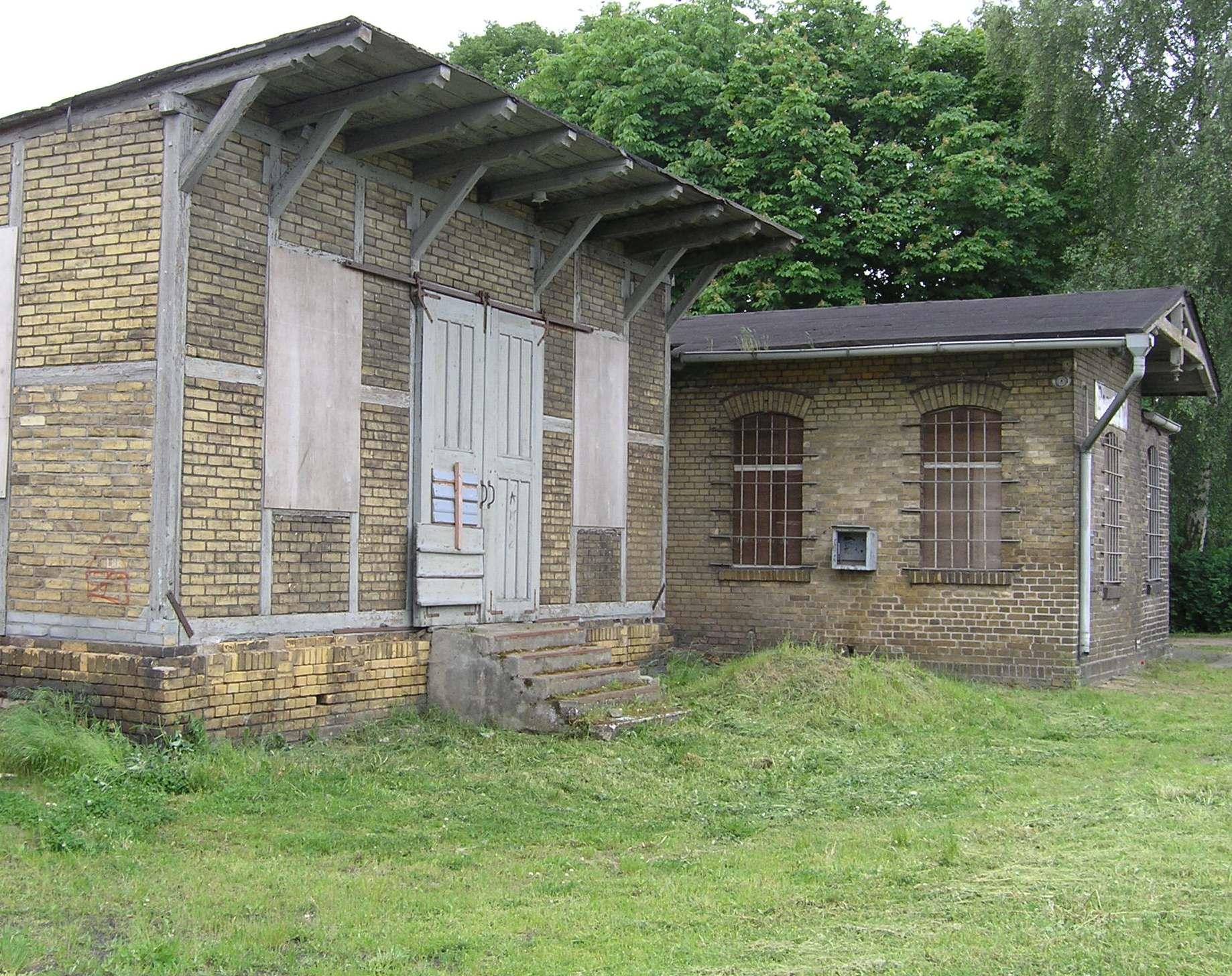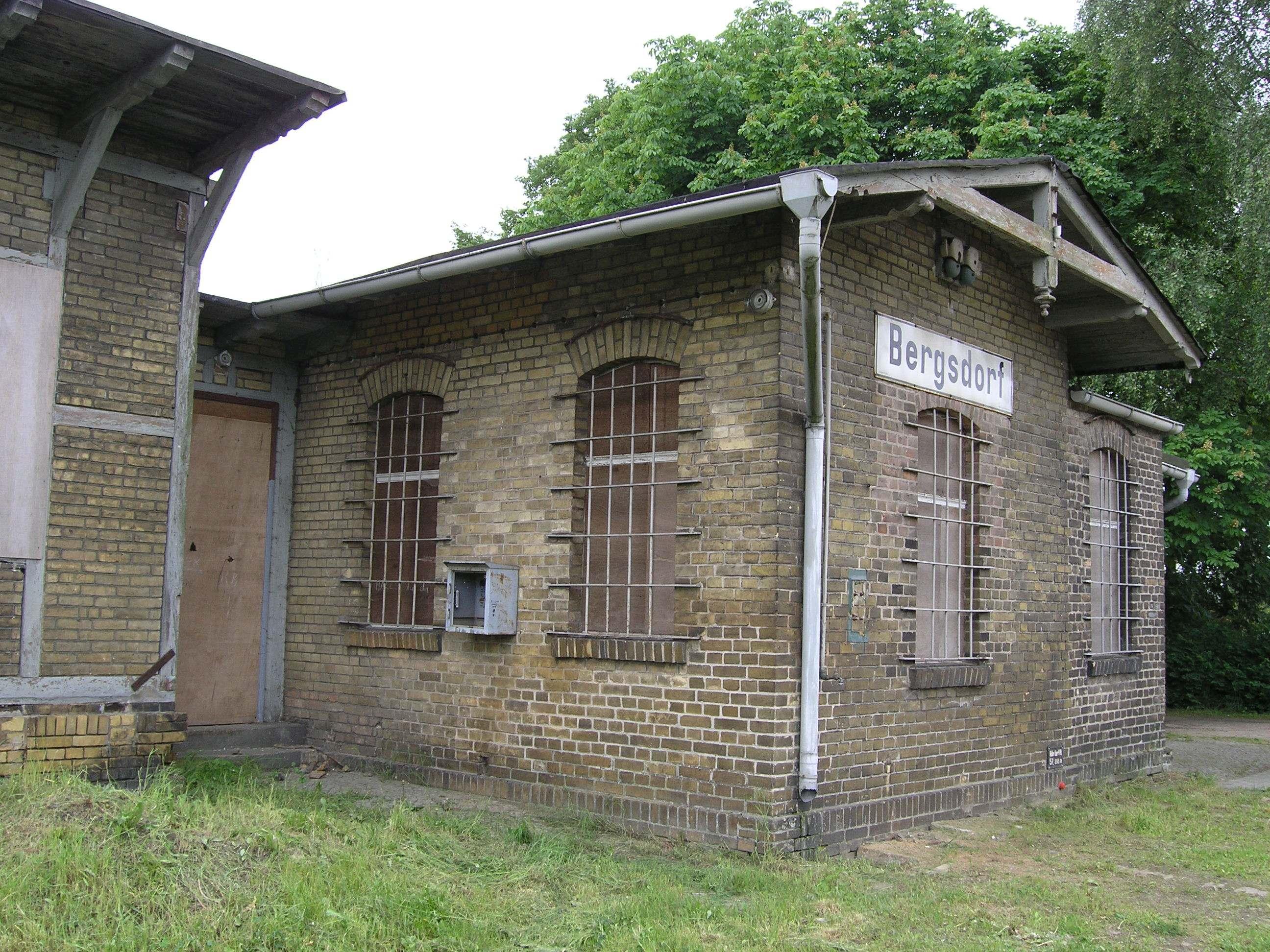 Bahnhof Bergsdorf, bestehend aus Empfangsgebäude, Güterschuppen und Pflasterung |