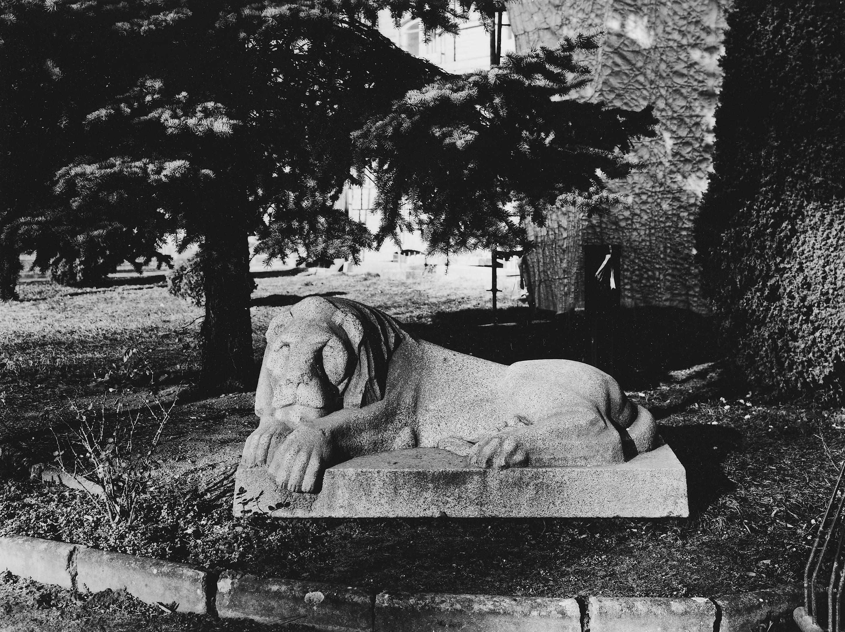 vor dem Haupteingang zwei Löwen vom ehemaligen Kaiser-Wilhelm-Denkmal auf dem Markt |